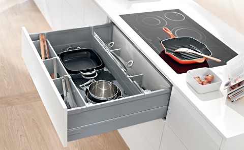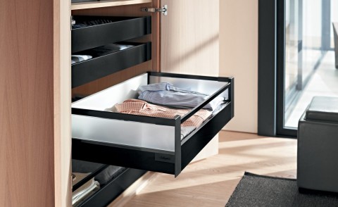 Le système Tandembox Antaro offre un grand confort de mouvement et une variété de design. La coulisse corps de meuble doit son coulissement ultra-léger aux rouleaux synthétiques à faible usure et à une capacité de charge dynamique de 30 kg ou 65 kg.